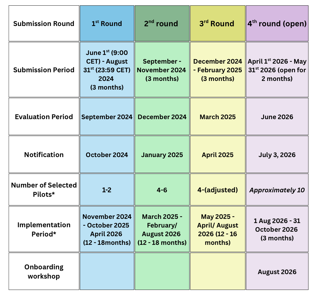 The open Call for Pilots is organised in four rounds, according to the expected schedule below.